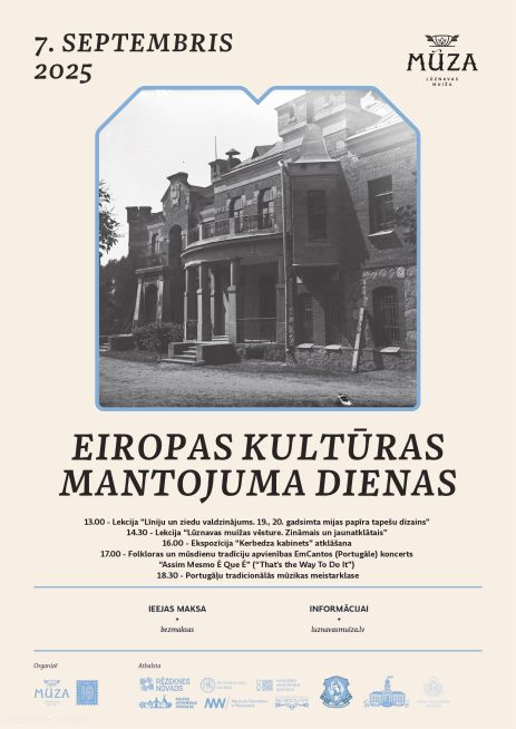 27.08.2025 Septembra sākumā, 7. septembrī, Rēzeknes novada Lūznavas muiža kļūs par šī gada Eiropas kultūras mantojuma dienu iesākuma vietu Latvijā un šo notikumu atklās, aicinot interesentus uz īpašu programmu, kas veltīta atdzimušās muižas desmitgadei, kuru tā atzīmēs līdz pat 2026. gada pavasarim. Visas dienas garumā muižā paredzētas izzinošas lekcijas, portugāļu mūzikas koncertprogramma, kā arī jaunas ekspozīcijas, kas veltīta muižas vēsturē nozīmīgajai Kerbedzu dzimtai, atklāšana.Svētdien, 7. septembrī, Lūznavas muižas viesiem visas dienas garumā būs iespēja doties ceļojumā laikā un telpā, piedzīvojot ierasto Eiropas kultūras mantojumu dienu svinēšanu muižā. Dienu iesāks divas izzinošas lekcijas — plkst. 13.00 mākslas vēsturniece, Rundāles pils muzeja direktore Laura Lūse stāstīs par 19.–20. gadsimta mijas papīra tapešu līnijām un ziedu rakstiem, bet plkst. 14.30 vēsturnieks Andris Uškāns dalīsies ar jauniem atklājumiem un līdz šim nezināmu informāciju par Lūznavas muižas vēsturi.