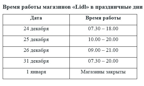 Чтобы дать людям возможность провести больше времени с близкими и в рождественские праздники, часы работы магазинов «Lidl» будут сокращены и на Рождество, а также в канун Нового года. Чтобы избежать предпраздничной лихорадки, мы призываем клиентов покупать продукты и подарки заблаговременно, а также проявлять уважение друг к другу.