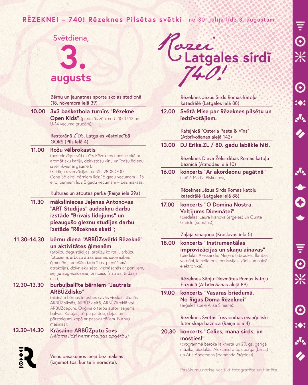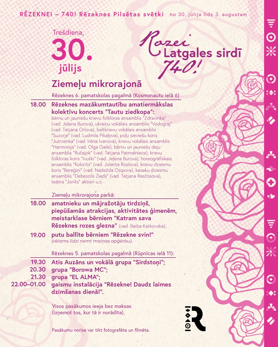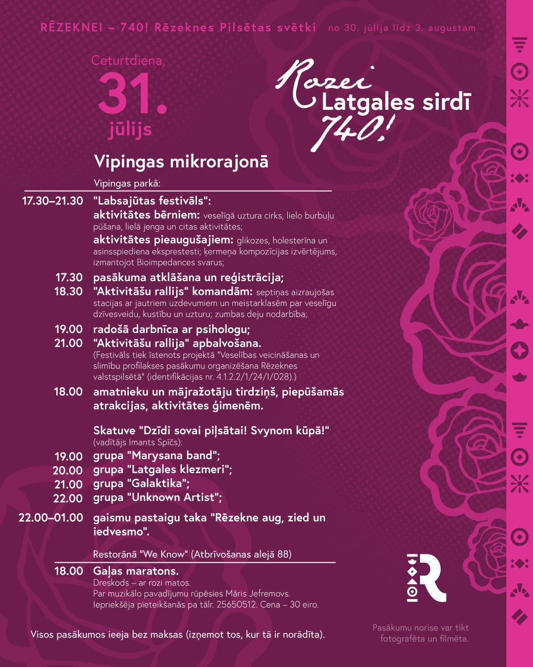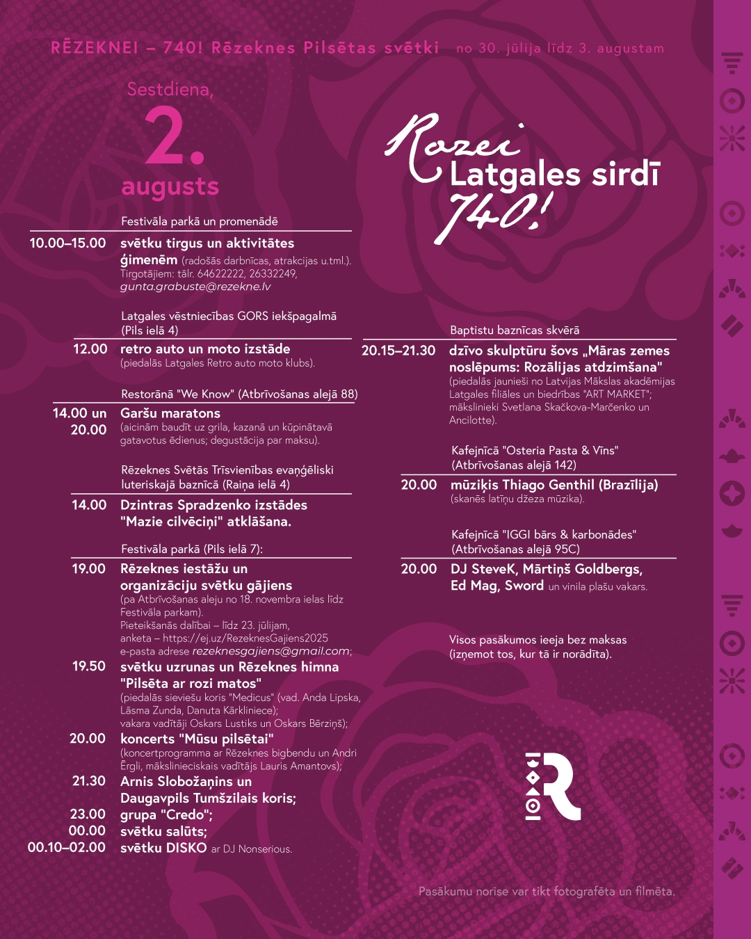 Неотъемлемой частью праздника города являются мероприятия праздничной ярмарки для семей в Фестивальном парке и на променаде, которая в этом году состоится в субботу, 2 августа, с 10-00 до 15-00. В 12-00 во внутреннем дворе посольства Латгалии "GORS" – выставка ретро машин и мотоциклов. Праздничное шествие учреждений и организаций Резекне "Розе в сердце Латгалии – 740!" начнется в 19-00 и в этом году оно будет особенно красивым, поскольку лейтмотивом праздника города является роза во всем своем великолепии и разнообразии (подай заявку). После шествия всех участников и гостей праздника города своими песнями порадуют Арнис Слобожанин, тёмно-синий хор Даугавпилса и группа "Credo". В сквере баптистской церкви (20-15 - 21-30) резекненская молодежь приглашает на шоу живых скульптур "Тайна земли Мары: Возрождение Розалии". Праздничный день завершится салютом в полночь и дискотекой до 2 часов ночи.