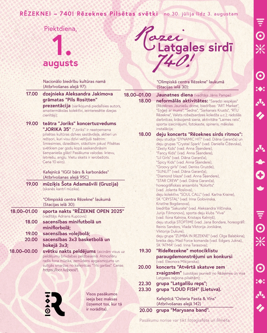Пятница, 1 августа, будет посвящена театру, спорту и молодежи. Театр "Йорик" в 19-00 приглашает на концертное представление "Йорику 35" (стоимость билетов 10 евро). Также в 19-00 на площади Резекненского Олимпийского центра начнется грандиозный день молодежи с неформальными мероприятиями "Увидь возможности!" и творческими мастерскими. Можно будет порадоваться талантам наших ребят - танцевальному концерту "В ритмах сердца Резекне" и концерту "Открытая сцена под звездами". Молодежь оценит показательные выступления мотоциклистов "RideRezekne", а также выступления групп “Latgalīšu reps” и “Loud Fish” (Литва). С 18-00 до 01-00 пройдет и традиционная спортивная ночь “Rēzekne Open 2025” (соревнования по мини-футболу и мини-флорболу, волейболу, баскетболу 3×3 и хоккею 3×3, подай заявку).