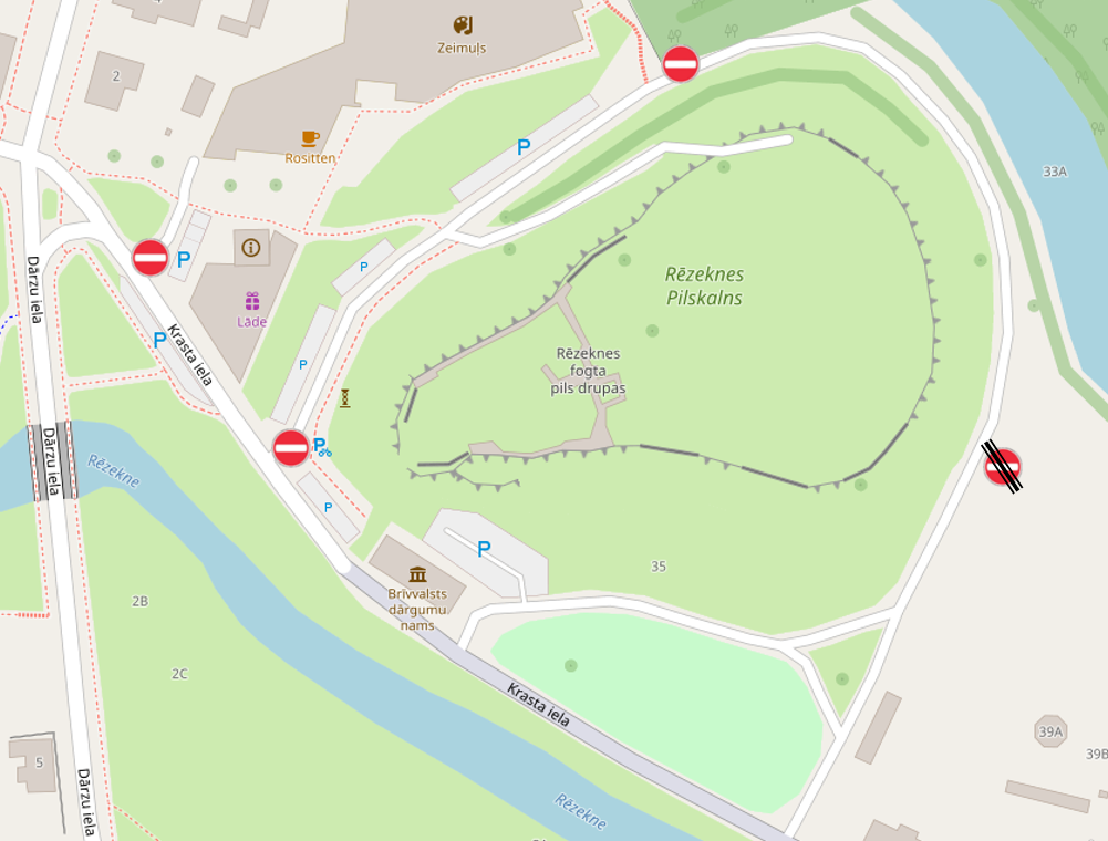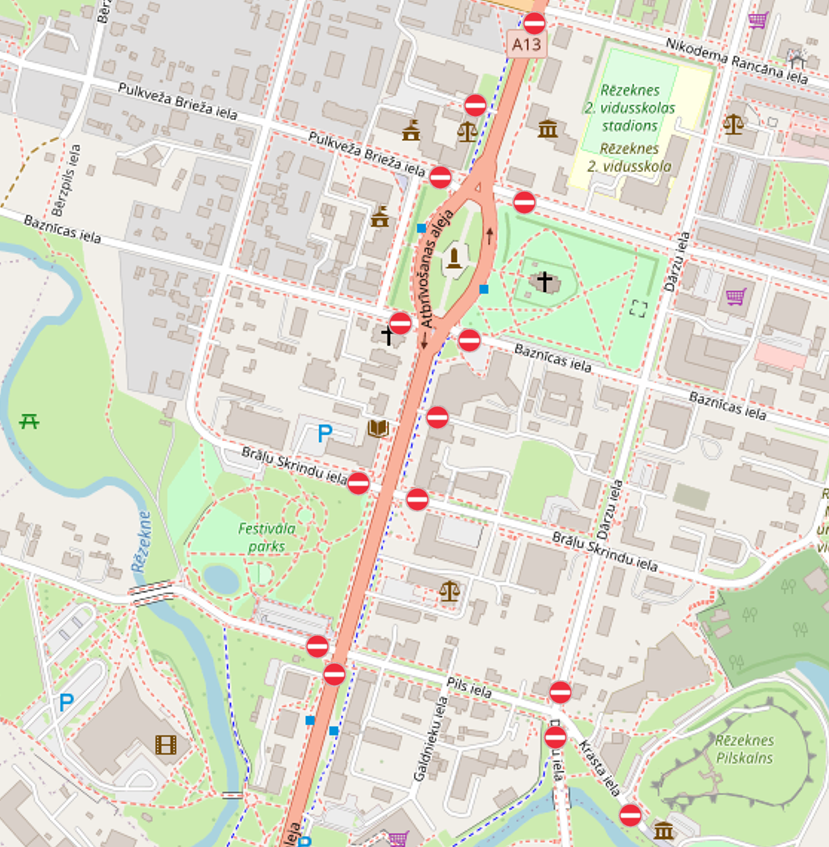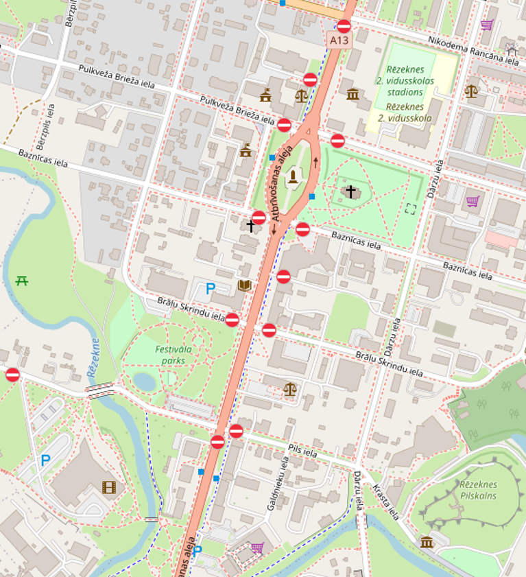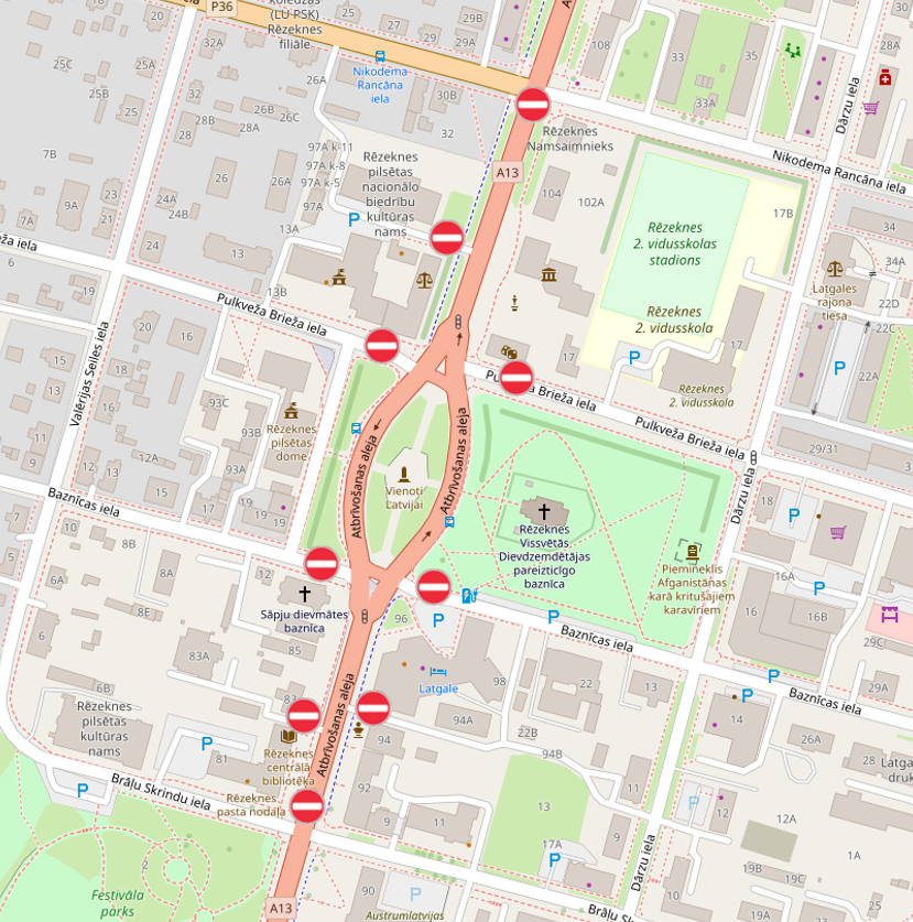 - с 12-40 до 12-50 – на участке аллеи Атбривошанас от улицы Н.Ранцана до улицы Пилс; на участке улицы Пилс от аллеи Атбривошанас до улицы Дарзу, а также на перекрестке улиц Дарзу, Пилс и Краста.