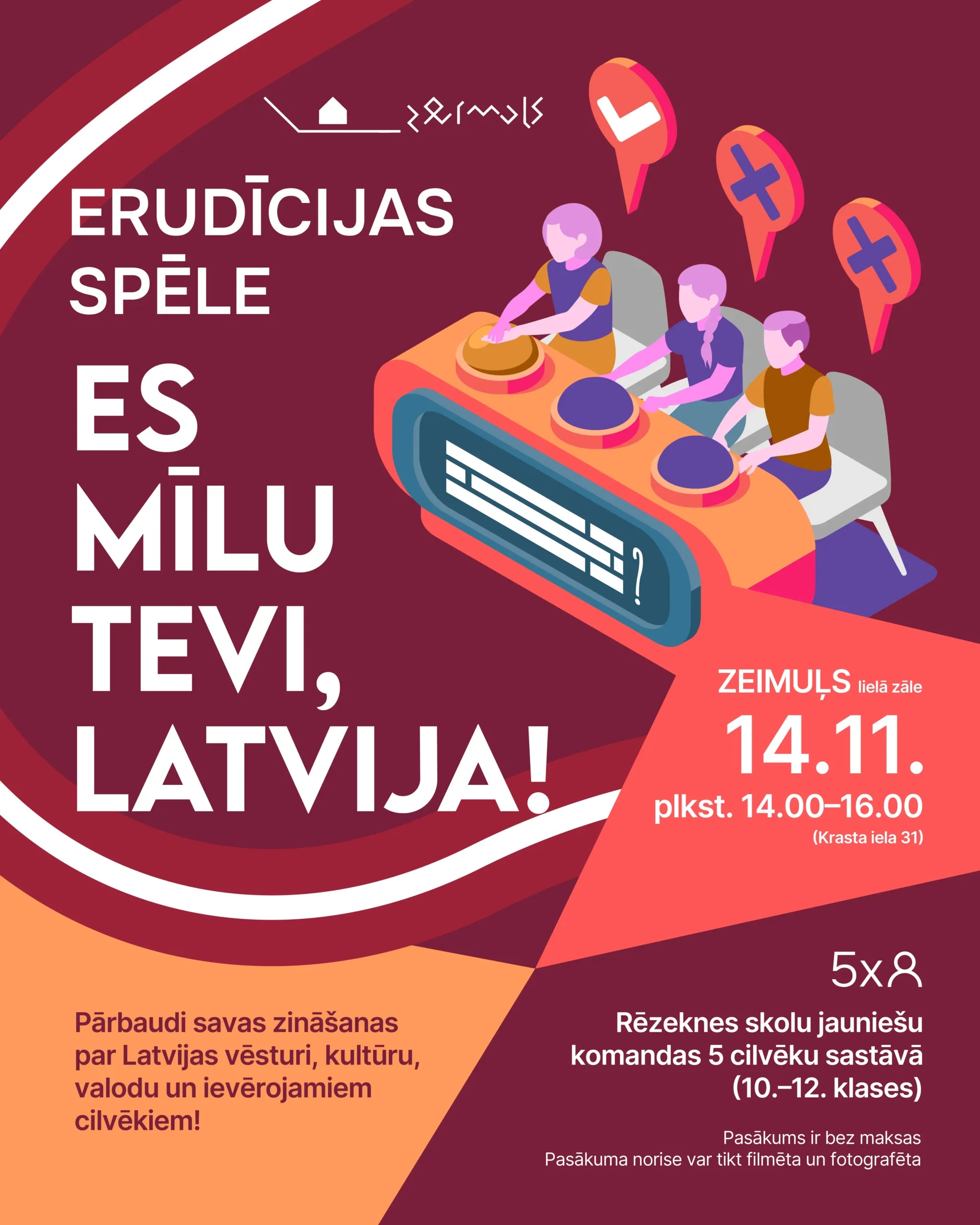 05.11.2025 Центр творческих услуг Восточной Латвии "Zeimuļs" приглашает учащихся Резекненских средних школ 14 ноября с 14-00 до 16-00 принять участие в увлекательной и патриотической игре на эрудицию, участвуя в которой можно проверить свои знания об истории, культуре, языке, кино и выдающихся людях Латвии.Участие: