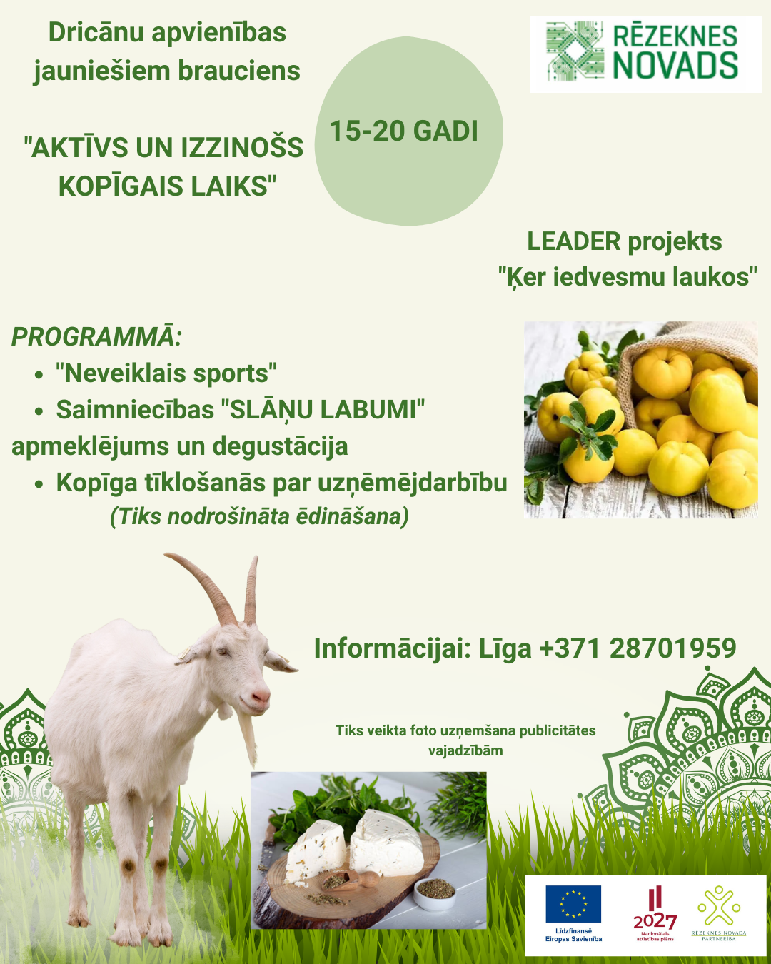 14.10.2025 В Дрицанском объединении в рамках поддерживаемого "молодежной инициативой" проекта LEADER "Лови вдохновение в селе!" будет организована поездка "Активное и познавательное совместное времяпровождение".Цель поездки - побудить молодежь развиваться и оставаться в родном месте, способствовать чувству гражданской принадлежности и участию. Познакомить молодежь с местными предприятиями.