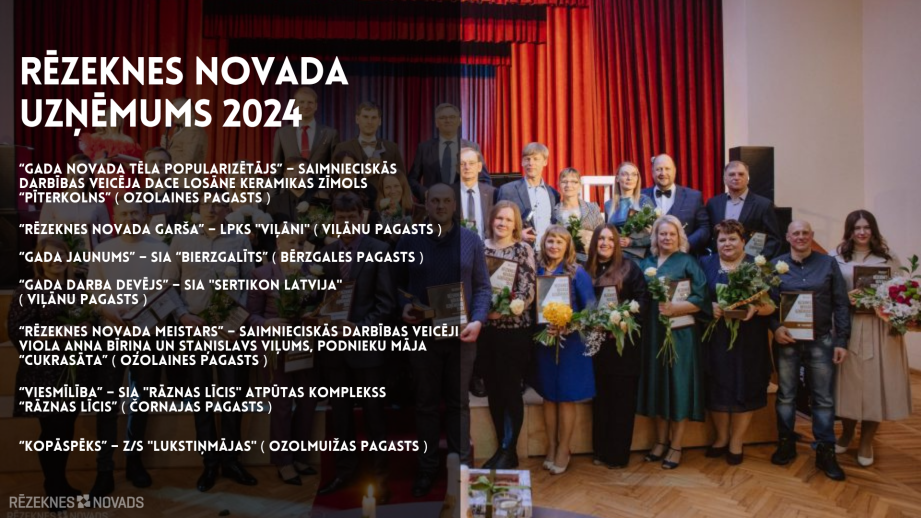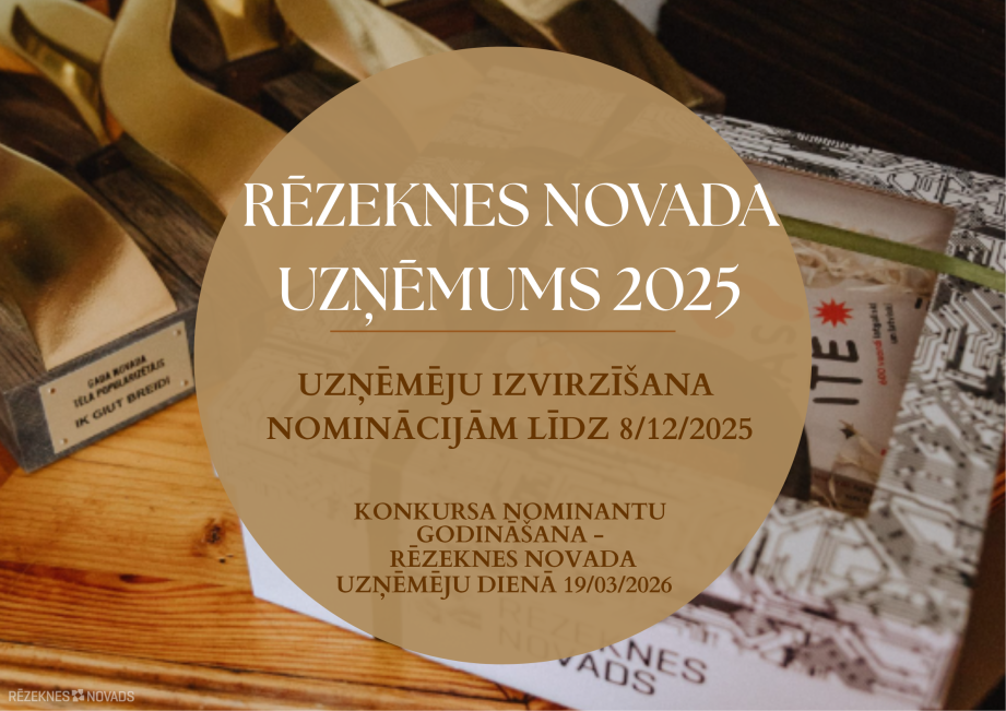 03.12.2025 Чтобы почтить лучших и самых активных предпринимателей Резекненского края, краевое самоуправление ежегодно проводит конкурс "Предприятие Резекненского края". Цель конкурса – выделить предпринимателей, которые активно действуют в крае, способствуют развитию предпринимательской среды и увязке с территорией, улучшают привлекательность производственных мест, занятость и рабочую среду, демонстрируют общественную активность и социальную ответственность, способствуют общественному и частному сотрудничеству, предлагают новые и инновационные товары или услуги, сохраняют навыки и местную культуру, одновременно популяризуя свои продукты и услуги и обеспечивая более широкую узнаваемость Резекненского края.В этом году претендентов предлагается выдвигать в следующих номинациях: