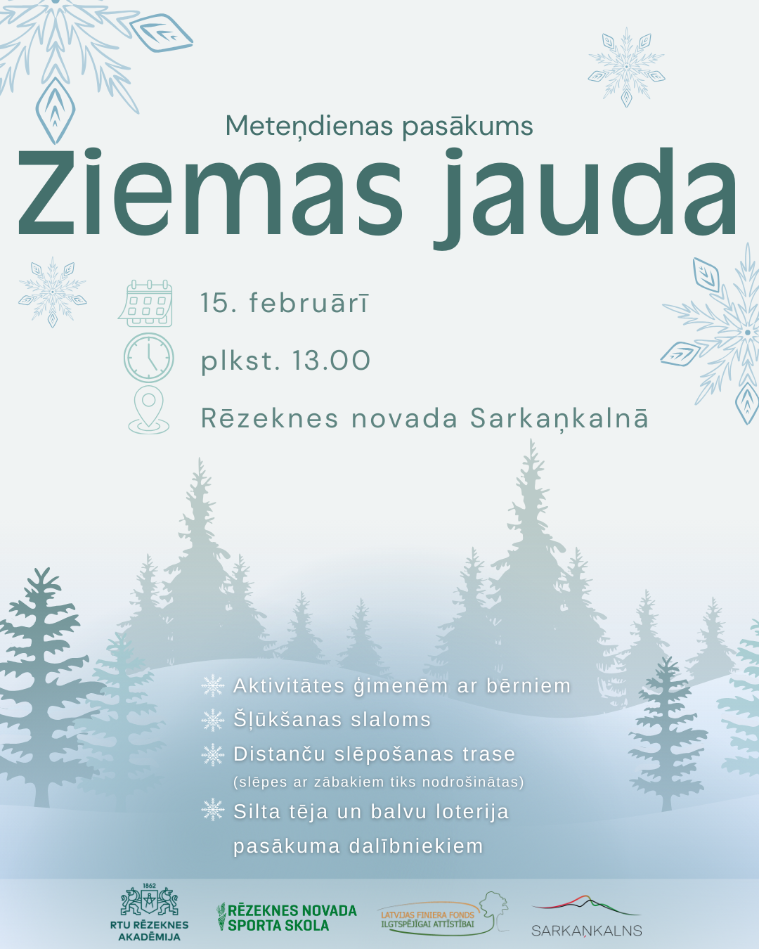 13.02.2026 Чтобы способствовать активному образу жизни и укреплять дух общины, в воскресенье, 15 февраля, в 13-00 в Сарканькалнсе Резекненского края (Веремская волость) состоится спортивное и развлекательное мероприятие "Мощь зимы".Мероприятие организует Резекненская краевая школа спорта в сотрудничестве с Резекненской академией РТУ. На спортивные зимние мероприятия приглашаются сотрудники Резекненской академии РТУ с семьями и студентами, а также жители Резекненского края, чтобы вместе насладиться зимними спортивными событиями и прекрасной природой в это время года.