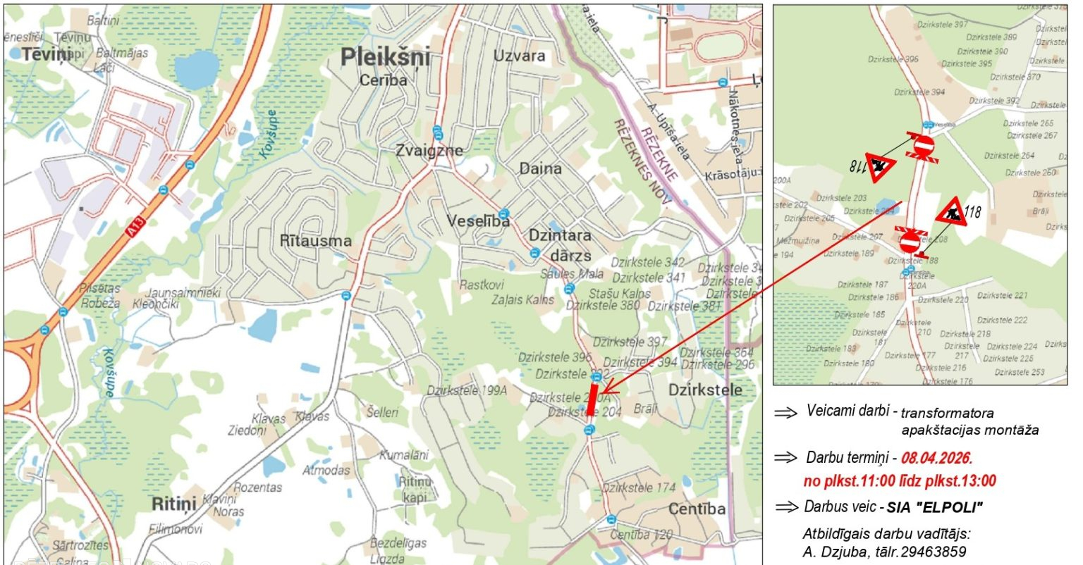 07.04.2026 Предприятие ''Elpoli'' информирует, что в селе Плейкшни Озолайнской волости будут проводиться монтажные работы трансформаторной подстанции.8 апреля 2026 года с 11-00 до 13-00 будет ограничено движение по улице Дзиркстелес в поселке Плейкшни, Озолайнская волость. Жителей призываются заранее планировать передвижение и с пониманием отнестись к временным неудобствам.