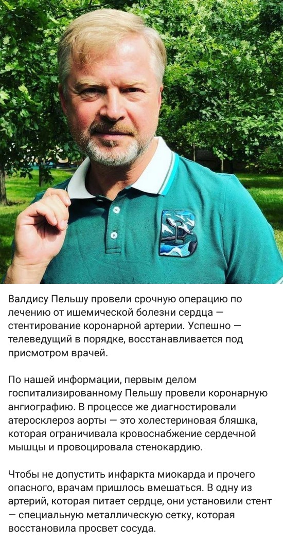 15.06.2023 На днях в СМИ появилась новость о том, что Валдис Пельш находится в больнице из-за проблем с сердцем. Теперь стало известно, что телеведущему провели срочную операцию по предотвращению инфаркта миокарда.Сейчас с 56-летнеим пациентам все хорошо, он восстанавливается после хирургического вмешательства, пишет StarHit.