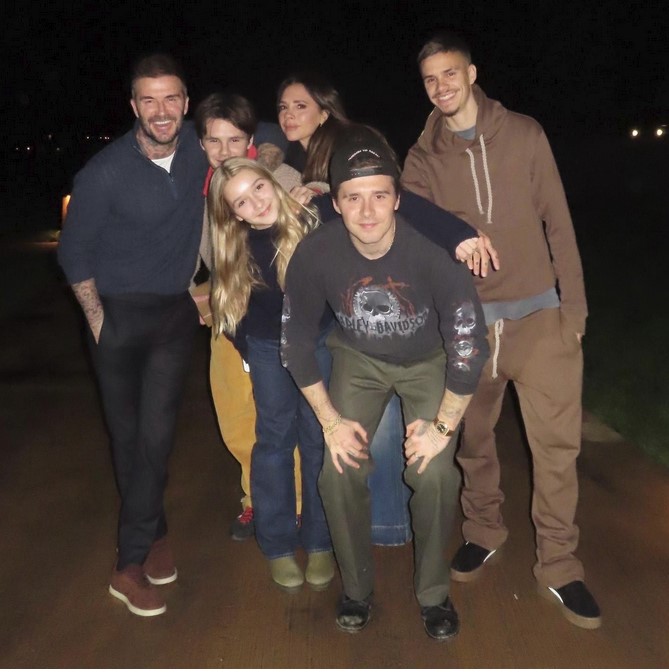 На семейной фотосессии Никола и Харпер были одеты в одинаковые красные пижамы в клетку и белые майки, в то время как Бруклин и Дэвид были в схожих комплектах из черных пижамных брюк и белых рубашек.