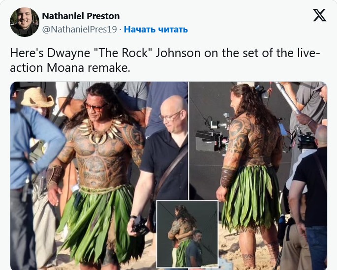 25.11.2024 В популярном мультфильме студии "Дисней" 2016 года "Моана" одну из главных ролей - гавайского полубога Мауи - озвучивал Дуэйн Джонсон. Когда студия решила переснять историю в формате фильма, ему же предложили сыграть эту роль. И вот съемки в разгаре.Дуэйн Джонсон переместил гавайского полубога Мауи из анимационного фильма "Моана" в реальный мир. 52-летний актер впервые появился в костюме и гриме персонажа на съемочной площадке переосмысления диснеевской сказки. Актер был одет в традиционную юбку из травы, на голове красовался черный парик, а все тело украшено татуировками персонажа. Съемки проходили на одном из пляжей Гавайских островов, сообщает Kinonews.
