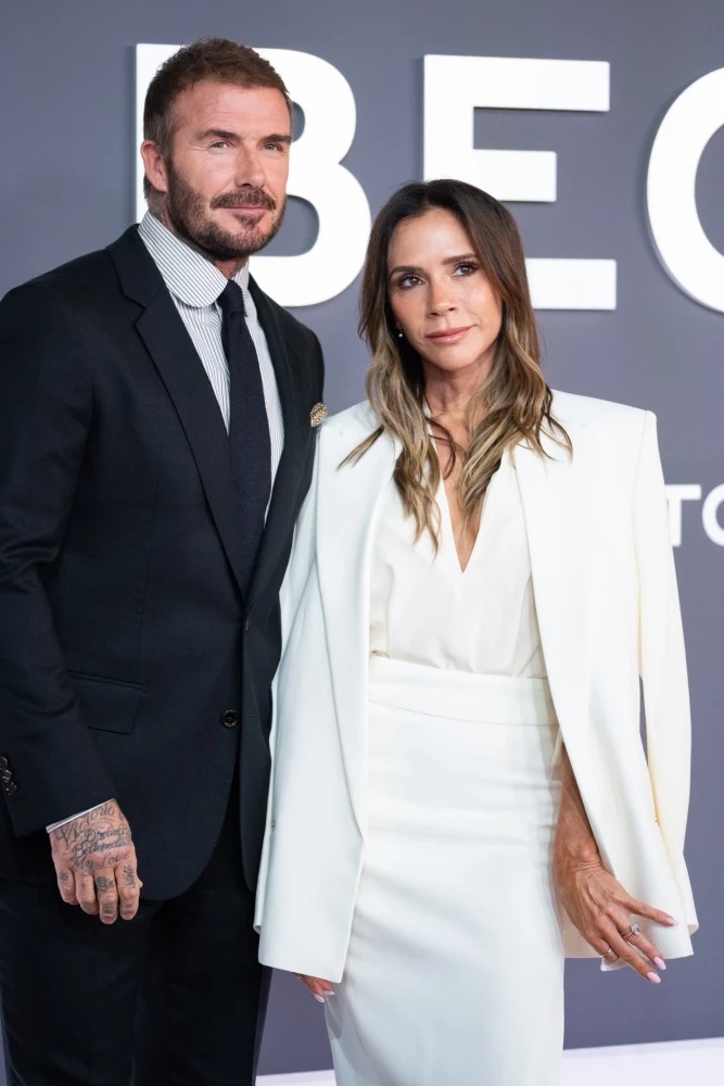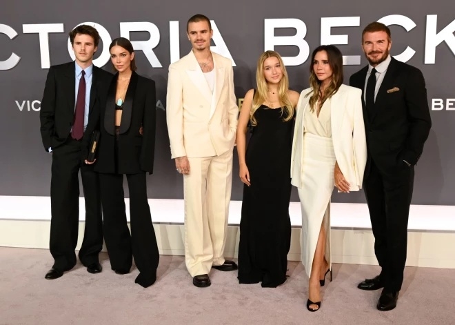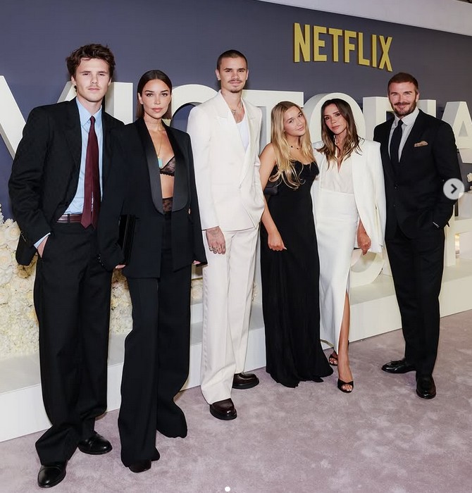 Рядом с ней на красной дорожке был её муж, 50-летний Дэвид Бекхэм, бывший капитан сборной Англии по футболу, который выглядел безупречно в тёмном костюме, полосатой рубашке и галстуке насыщенного синего цвета. Пару поддерживали их трое детей — Ромео (23 года), Круз (20 лет) и Харпер (14 лет). Круз пришёл вместе со своей девушкой, 30-летней Джеки Апостел.
