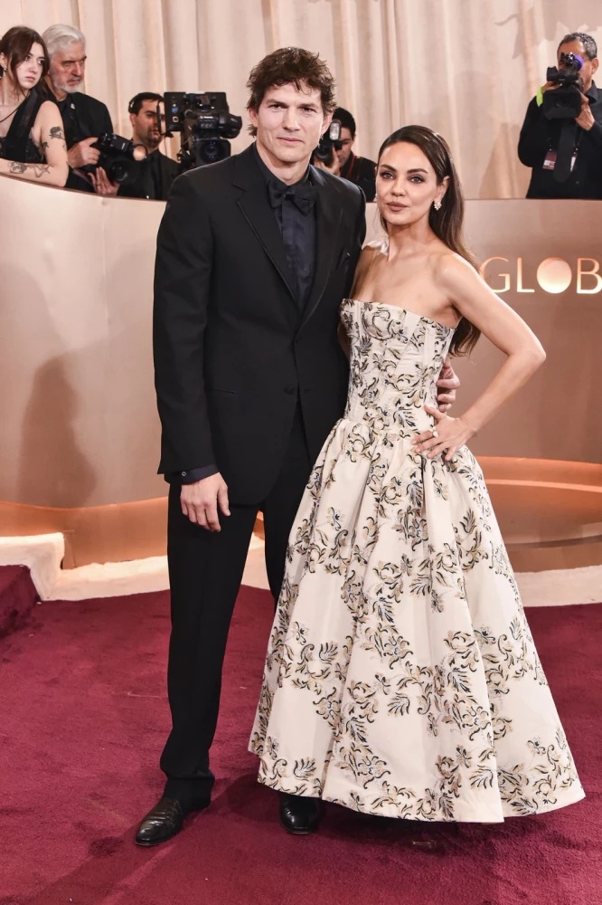 В 2026 году на дорожке пара позировала фотографам. 42-летняя Кунис появилась в черно-белом платье Carolina Herrera без бретелей с юбкой длины миди. 47-летний Катчер выбрал полностью черный костюм.