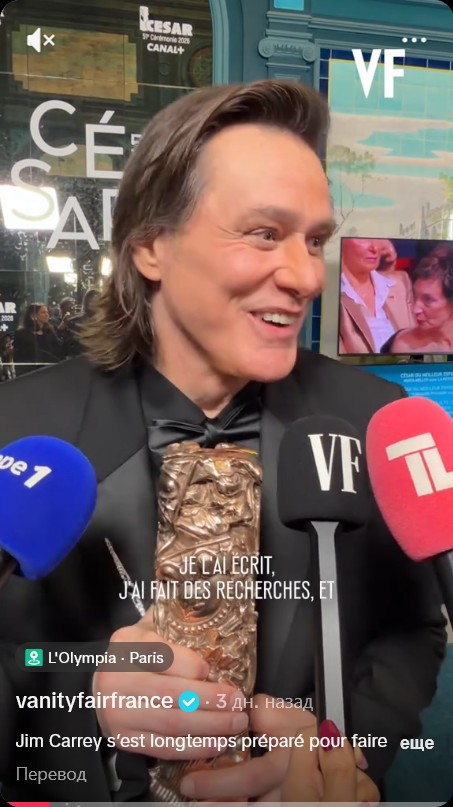 64-летний Джим Керри произвел настоящий фурор на 51-й церемонии премии "Сезар" в Париже. Актер получил почетный «Сезар» за вклад в мировое кино — важную веху в карьере, растянувшейся на десятилетия.