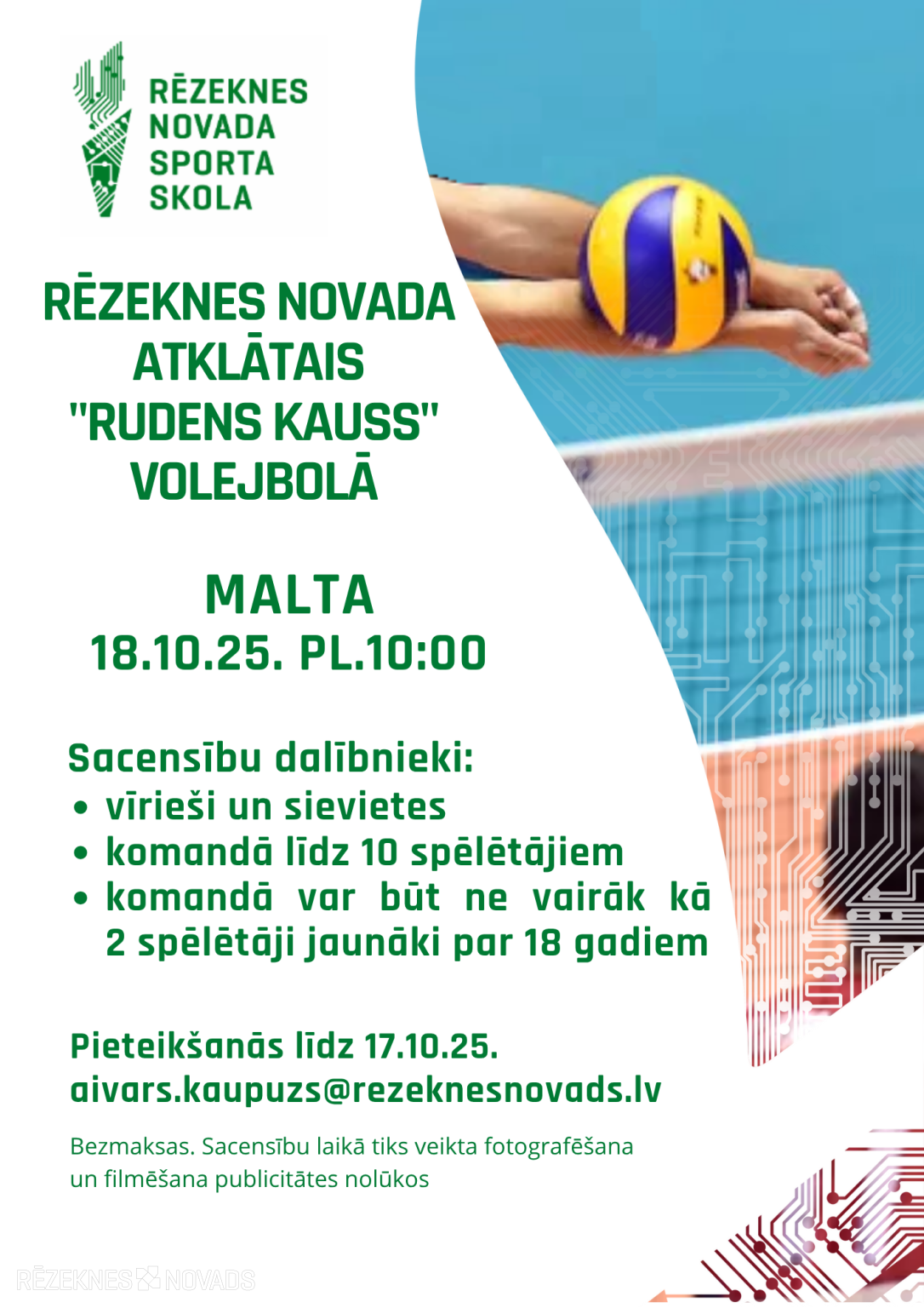 08.10.2025 Самоуправление Резекненского края приглашает принять участие в открытом турнире Резекненского края "Осенний кубок" по волейболу!18 октября в Малтском многофункциональном зале состоится открытый турнир Резекненского края "Осенний Кубок" по волейболу, чтобы определить лучшие мужские и женские команды.