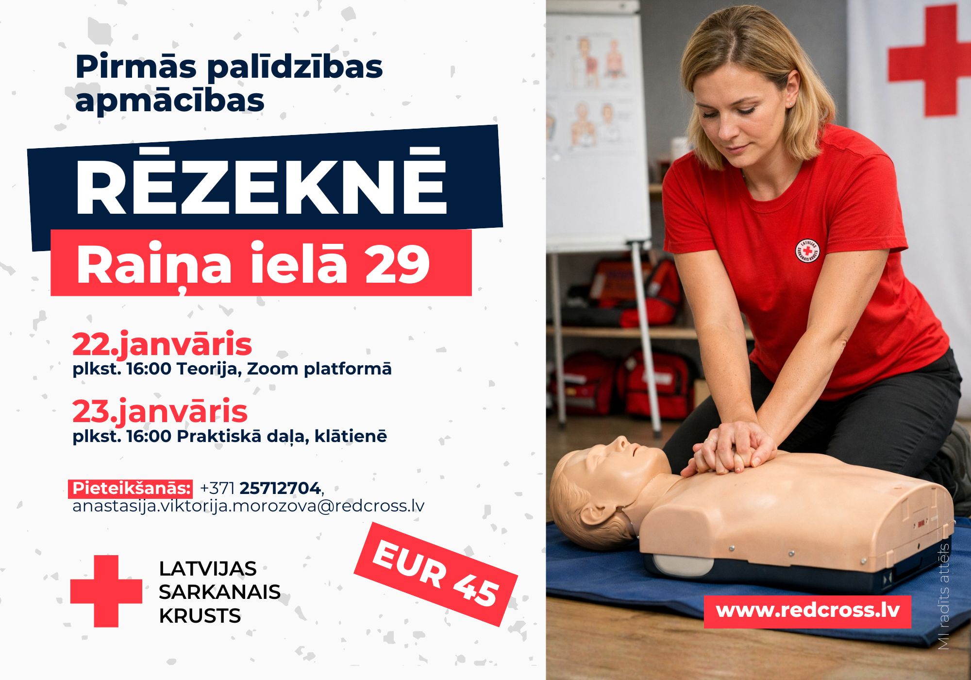 13.01.2026 Латгальский комитет Латвийского Красного креста (ЛКК) приглашает подать заявку на обучение оказанию первой помощи в Резекне.Теоретическая часть состоится 22.01.2026 в 16-00 на платформе ZOOM.