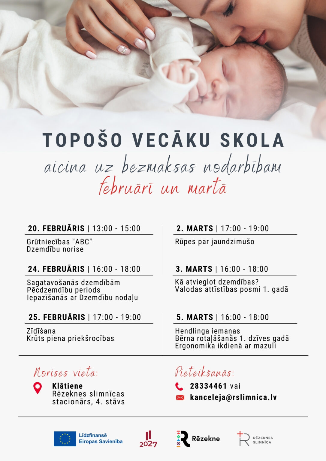 В феврале и марте 2026 года пройдут шесть занятий цикла — 20, 24 и 25 февраля, а также 2, 3 и 5 марта. График занятий доступен на сайте больницы www.rslimnica.lv. Чтобы посетить занятия, родителей просят своевременно подать заявку, позвонив по телефону 28334461 или написав на э-почту: [email protected]. Занятия пройдут на 4-м этаже стационара Резекненской больницы (ул. 18 Новембра, 41, Резекне).