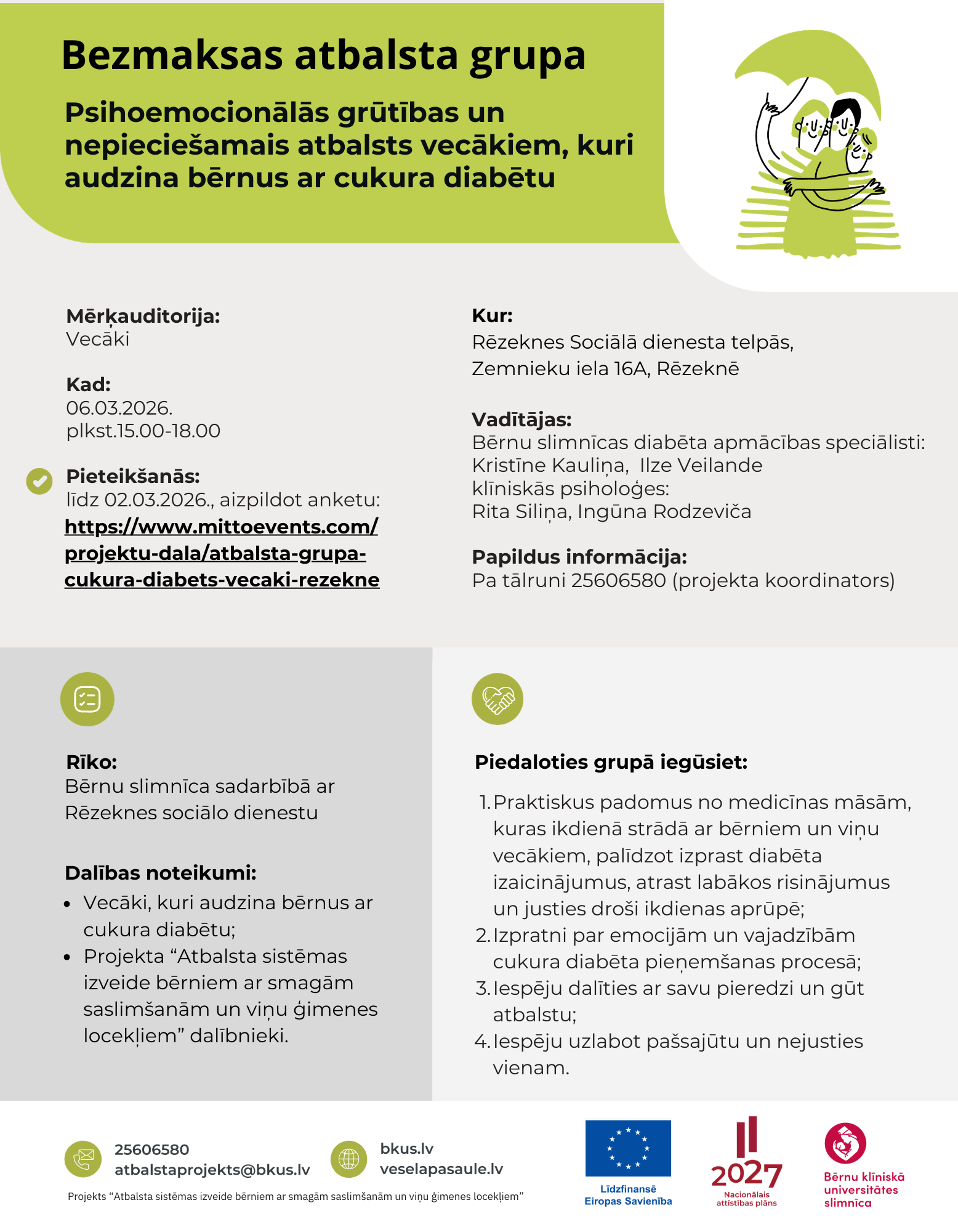 19.02.2026 Детская клиническая университетская больница приглашает родителей в Резекне и крае, воспитывающих детей с сахарным диабетом, на очный урок поддержки 6 марта с 15:00 до 18:00! Занятие пройдет в Резекненской социальной службе по адресу: ул. Земниеку, 16А, Резекне.Мы будем искренне ждать каждого родителя – это будет безопасная и понимающая среда, где можно встретить других родителей, находящихся в похожей ситуации, получить профессиональную поддержку и просто побыть с людьми, которые понимают.