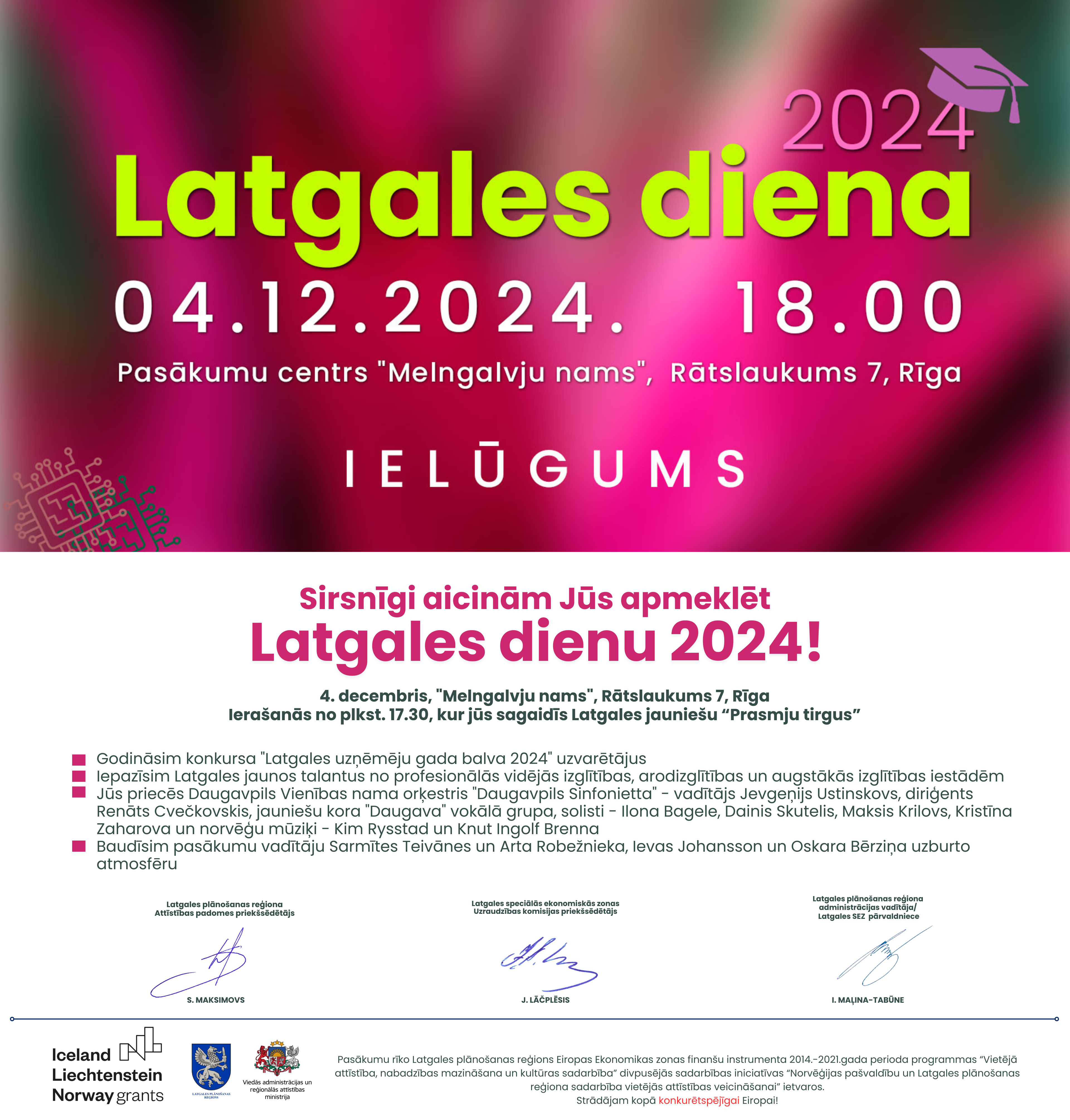 Aicinām sekot līdzi aktuālajai informācijai par “Latgales dienas 2024” norisi Latgales plānošanas reģiona interneta vietnē www.lpr.gov.lv, Latgales plānošanas reģiona Facebook lapā.