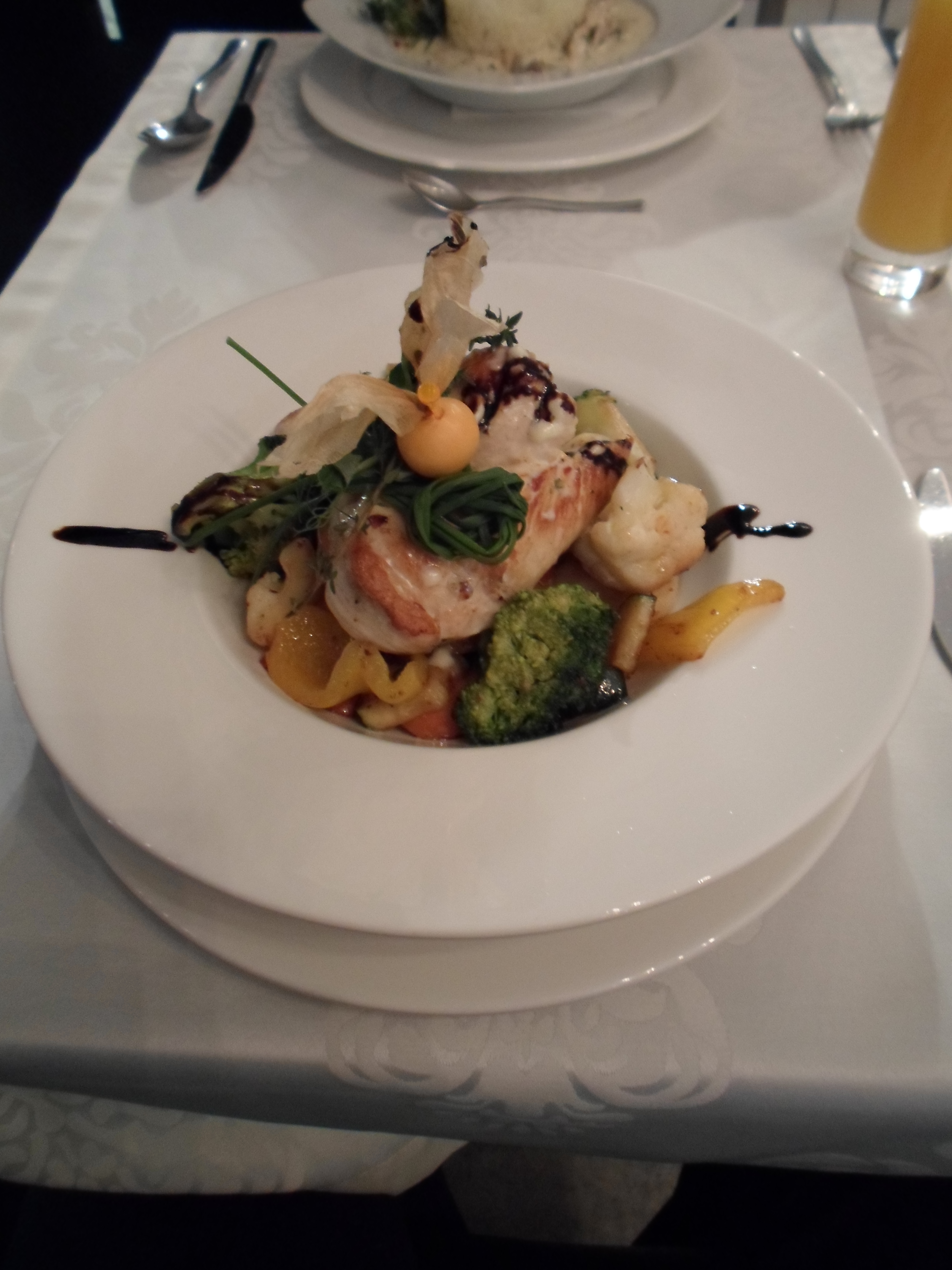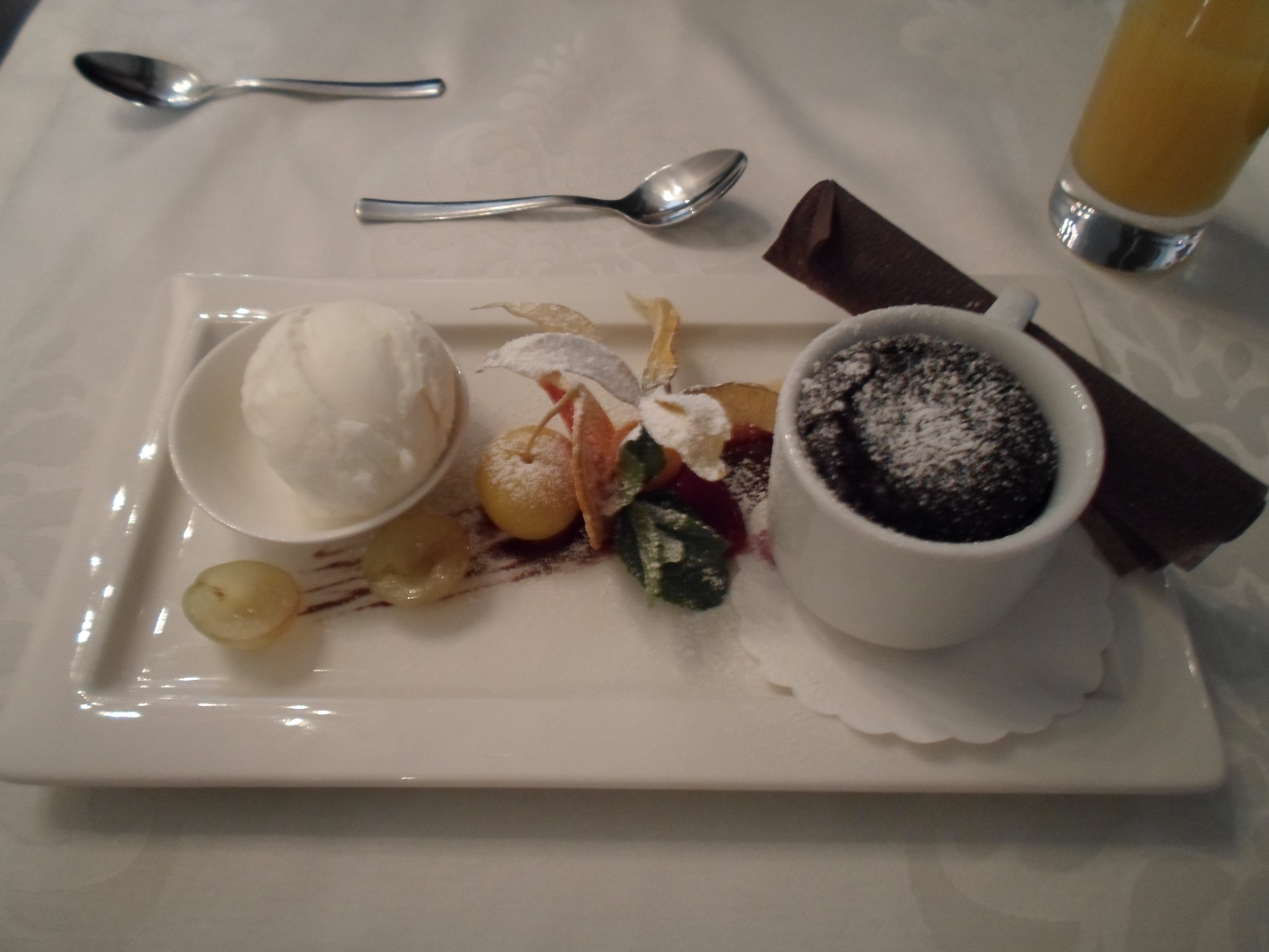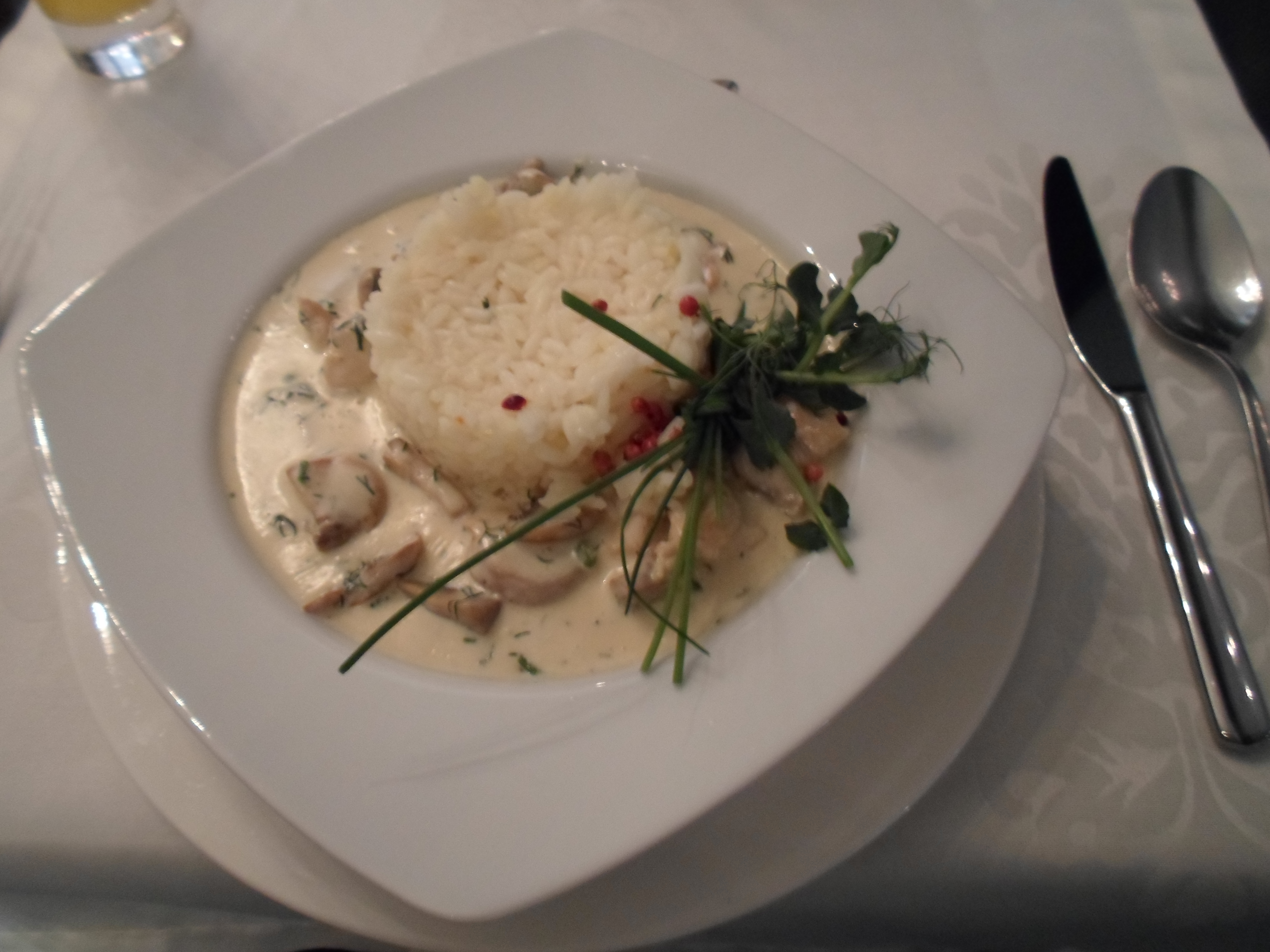 Mēs izvēlējāmies vistas frikasē ar sēnēm, vistu ar dārzeņiem, kafiju, sulu un šokolādes fondantu.