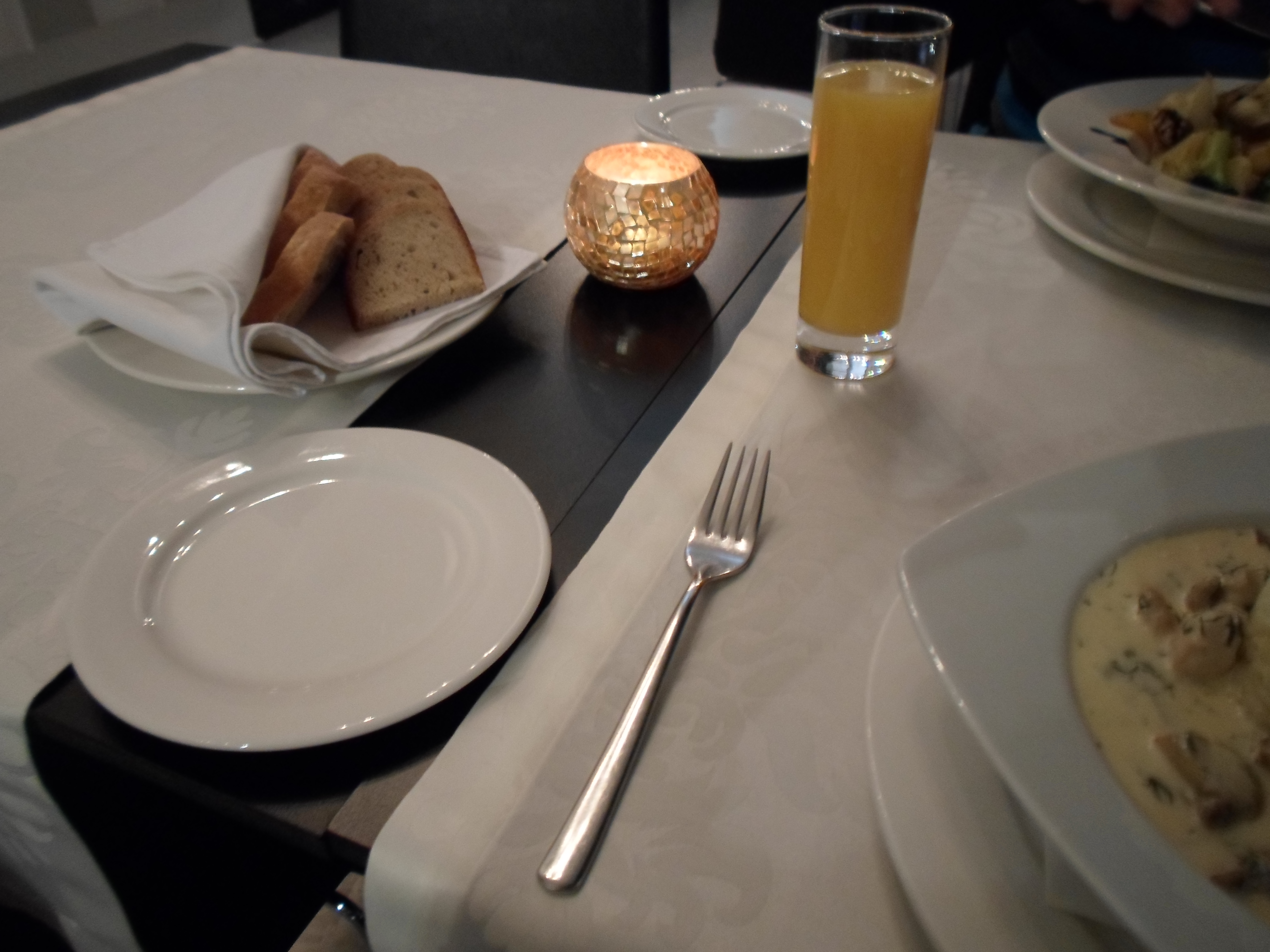 Redzams, ka tīrībai šeit tiek sekots īpaši rūpīgi, galdiņu virsmas burtiski spīd un laistās, arī galdauti sniegbalti. Tiklīdz bijām izvēlējušies galdiņu, uzreiz pienāca klāt oficiante, aizdedzināja sveci un iedeva ēdienkarti katram.