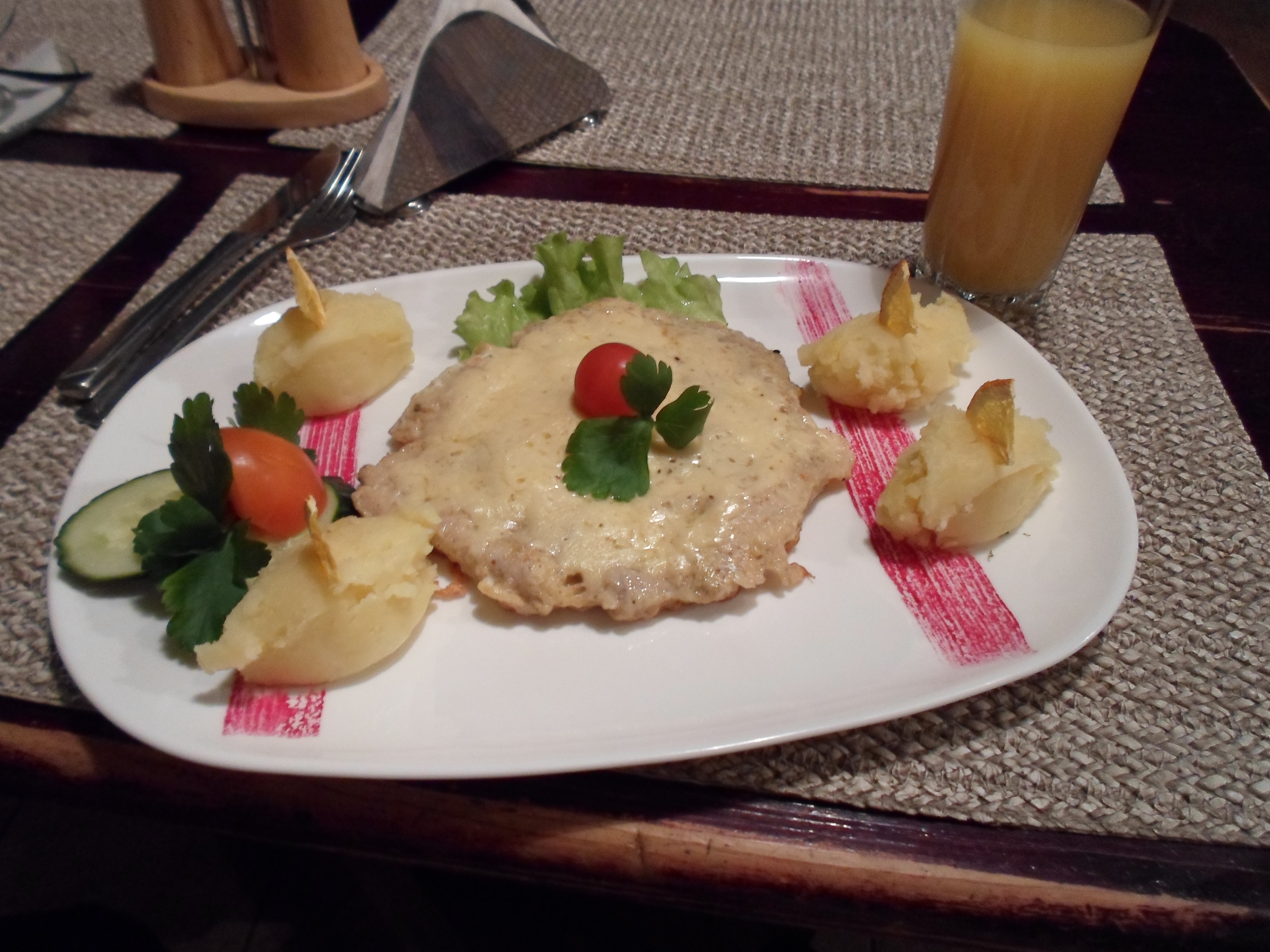 Mūsu izvēlē apstājāmies pie kotletēm ar sēņu mērci un ceptiem kartupeļiem, cūkgaļas karbonādes ar kartupeļu biezeni, kafiju, sulu un desertu.