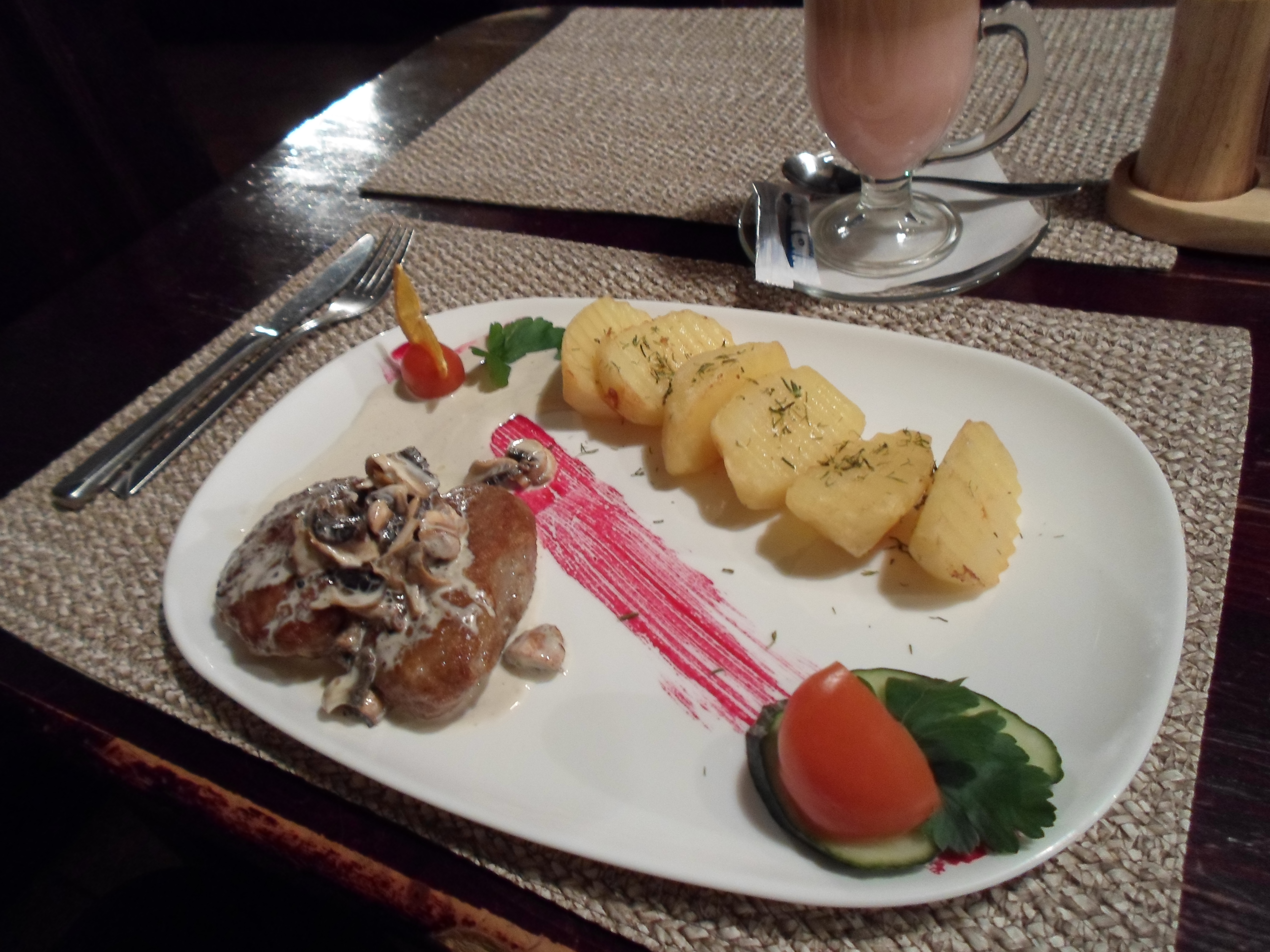 Gaļa un kotletes bija izcili sagatavotas, kotletes bija garšīgas, maigas, nepārsālītas, kartupeļi arī garšīgi. Sēņu mērce arī.