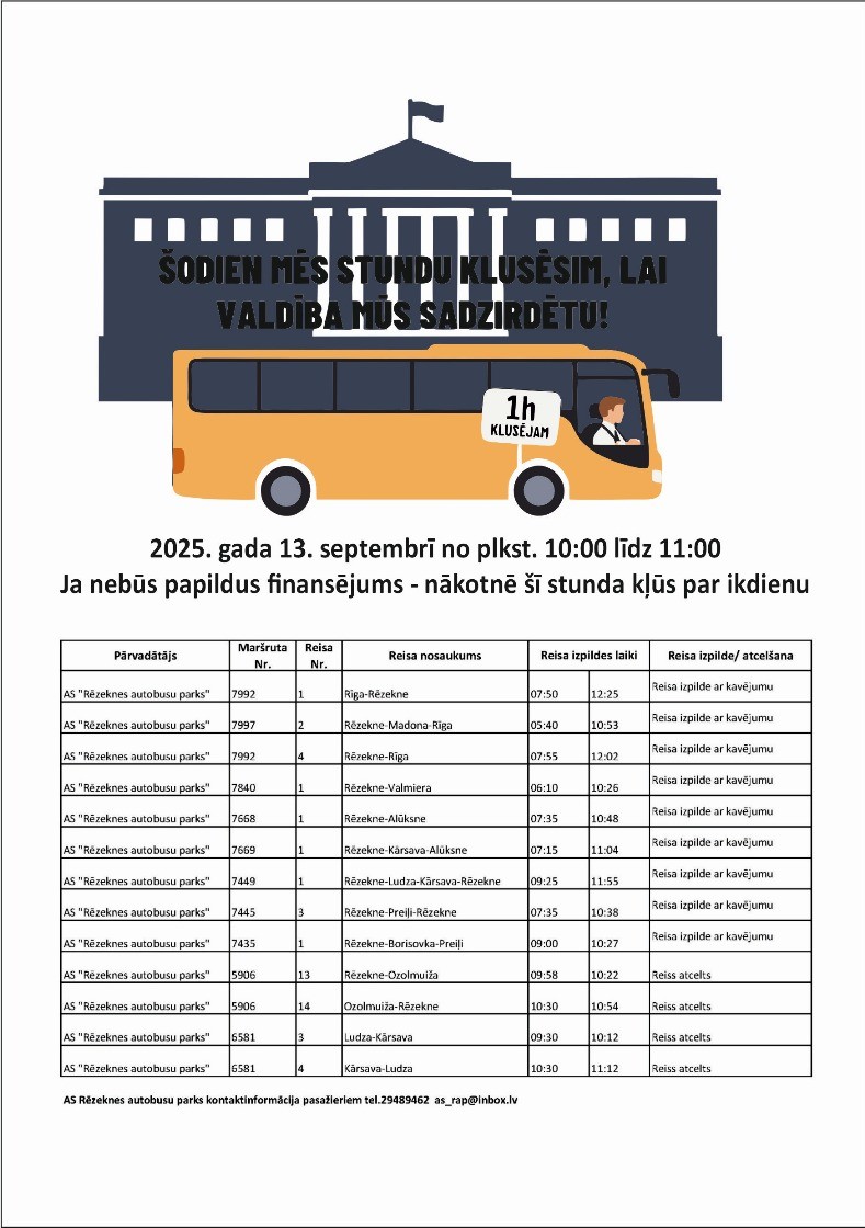 15.09.2025 Lai pievērstu uzmanību kritiskajai situācijai sabiedriskā transporta nozarē, kur nepietiekams finansējums apdraud kvalitatīvu pakalpojumu sniegšanu, pasažieru pārvadātāji visā Latvijā 16. septembrī rīkos protesta akciju “Viena stunda bez sabiedriskā transporta”. No plkst. 10.00 līdz 11.00 visi akcijā iesaistītie pārvadātāji apturēs pakalpojumu sniegšanu – autobusi neizbrauks reisos vai reisa izpildes laikā apstāsies atbilstošās, pasažieriem drošās vietās.Akcijā piedalīsies pasažieru pārvadātāji, kas sniedz sabiedriskā transporta pakalpojumus reģionālās nozīmes pārvadājumos un kuriem ir noslēgts ilgtermiņa līgums ar valsts SIA “Autotransporta direkcija”. Tādējādi autobusu kustību vienu stundu 16. septembrī pārtrauks SIA “Daugavpils autobusu parks”, AS “Talsu autotransports”, SIA “Tukuma auto”, AS “Rēzeknes autobusu parks”, SIA “VTU Valmiera”, SIA “Norma A”, AS “Liepājas autobusu parks”, AS “Nordeka”, PSIA “Ventspils reiss”.