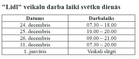 31.12.2025 Jau trešo gadu pēc kārtas "Lidl" sniedz iespēju visai uzņēmuma komandai atpūsties un nosvinēt Jaunā gada atnākšanu kopā ar ģimeni un tuvākajiem cilvēkiem, tādēļ visi "Lidl" veikali arī 2026. gada 1. janvārī būs slēgti.Saīsināts darba laiks būs arī Vecgada vakarā, 31. decembrī. Informācija par veikalu darba laikiem svētku dienās klientiem pieejama veikalos, mājaslapā www.lidl.lv un "Lidl Plus" lietotnē.