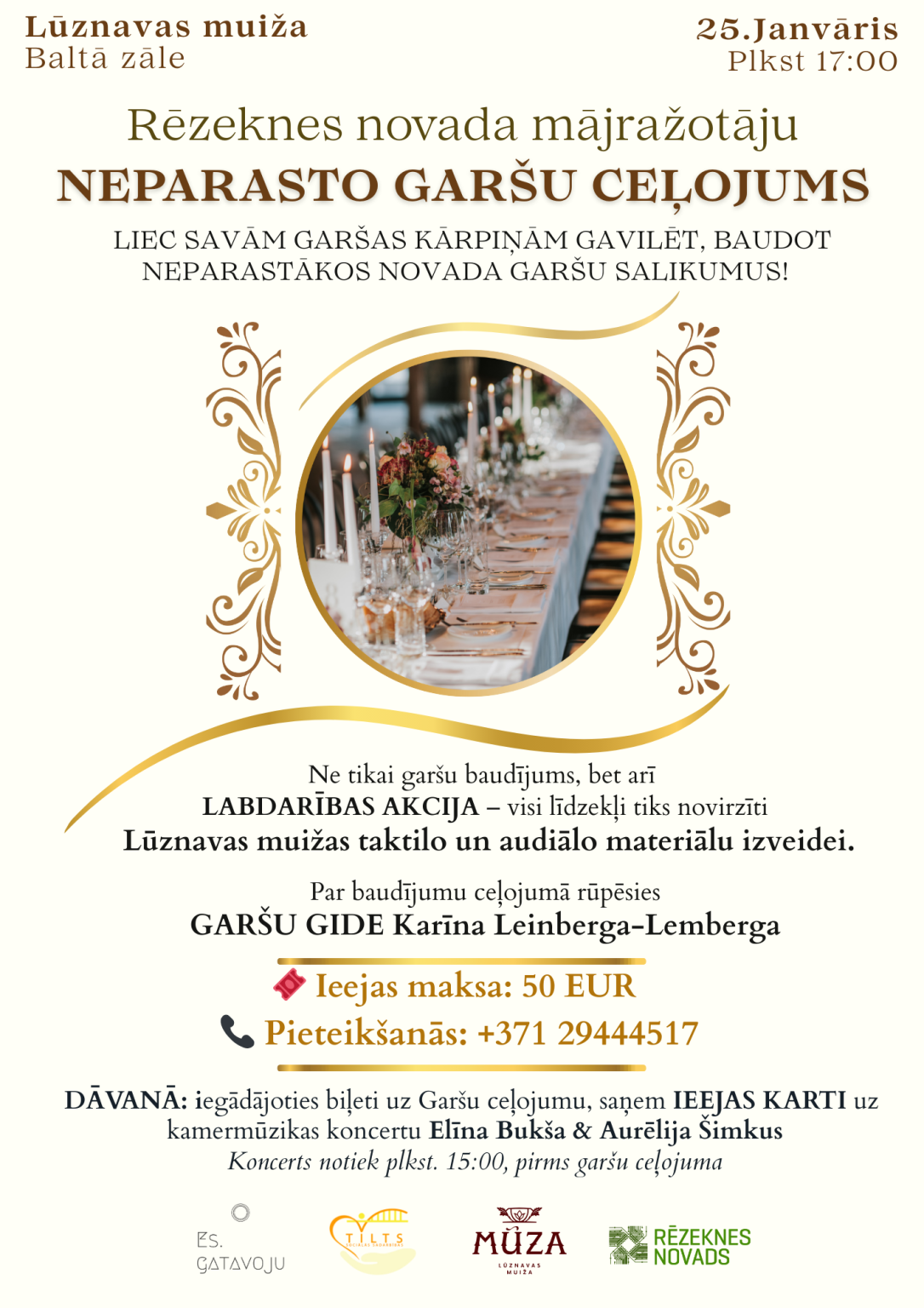 Pasākuma apmeklētājiem sagatavota arī īpaša dāvana — iegādājoties biļeti uz garšu ceļojumu, vakariņu dalībnieki pēcpusdienas baudījumu muižā varēs sākt ar muižas Sarkanajā zālē gaidāmo vijolnieces Elīnas Bukšas un pianistes Aurēlijas Šimkus koncertprogrammu “Kamermūzikas pērles”, kas Lūznavas muižā arī notiks 25. janvārī – plkst. 15.00, mirkli pirms garšu ceļojuma.