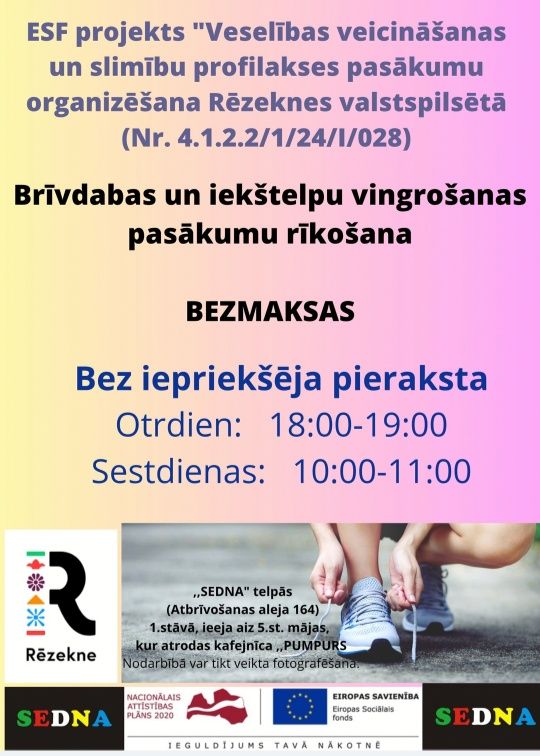 14.10.2025 Oktobrī sporta biedrība "SEDNA" piedava apmeklēt bezmaksas veselības veicināšanas projekta aktivitātēs Rēzeknē: sporta nodarbības bez iepriekšēja pieraksta "SEDNA" sportā zālē.Nodarbības notiks: