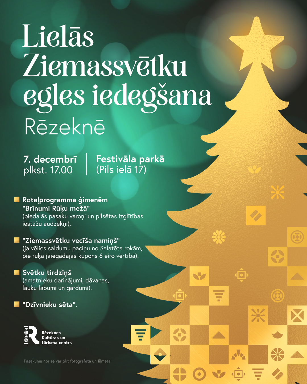 05.12.2025 Jau pavisam drīz Rēzekne iemirdzēsies Ziemassvētku gaismās! Rēzeknes pašvaldība aicina visus pilsētas iedzīvotājus un viesus uz Ziemassvētku egles iedegšanas svētkiem 7. decembrī plkst. 17.00 Festivāla parkā.Jūs sagaidīs: