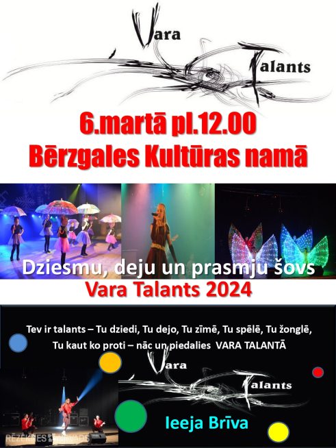 06.02.2024 До 20 февраля молодые таланты приглашаются записаться на шоу песен, танцев и других умений "Vara Talants", в рамках которого встречаются молодые певцы, танцоры и артисты, чтобы продемонстрировать свои умения и таланты широкой публике.Мероприятие состоится 6 марта в Берзгальском доме культуры. На нем школьники получат возможность творчески проявить себя и показать свои таланты в различных областях искусства.